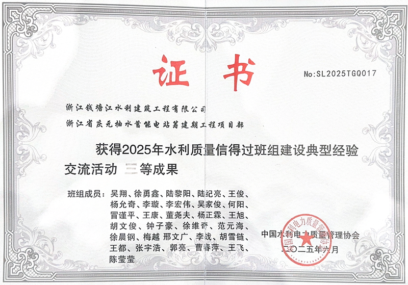 近日,中國水利電力質(zhì)量管理協(xié)會公布2025年度水利質(zhì)量信得過班組建設(shè)典型經(jīng)驗(yàn)交流活動評選結(jié)果,慶元抽蓄籌建期EPC總承包項(xiàng)目憑借扎實(shí)有效的質(zhì)量管理實(shí)踐和突出的建設(shè)成果,榮獲“2025年水利質(zhì)量信得過班組建設(shè)典型經(jīng)驗(yàn)交流活動”三等成果。這一榮譽(yù)不僅為“浙錢水建”品牌再添光彩,更標(biāo)志著公司在工程質(zhì)量管理領(lǐng)域獲得了行業(yè)權(quán)威機(jī)構(gòu)的高度認(rèn)可。